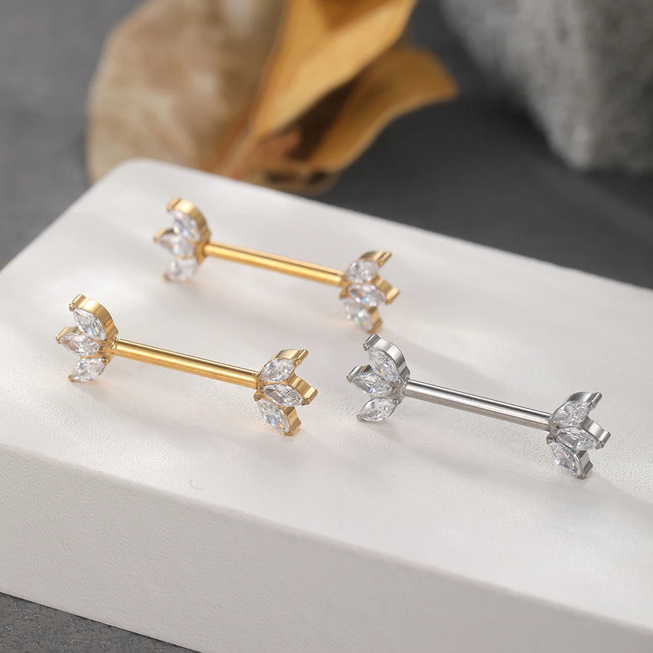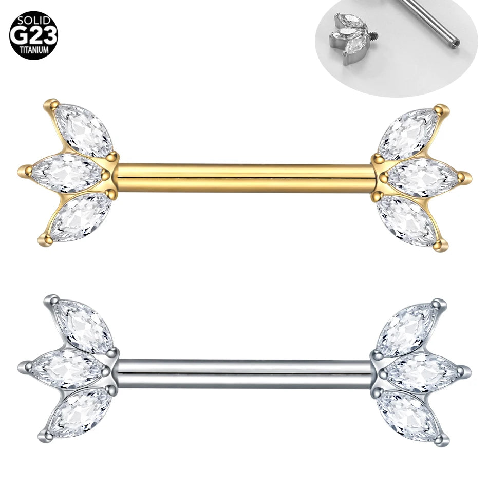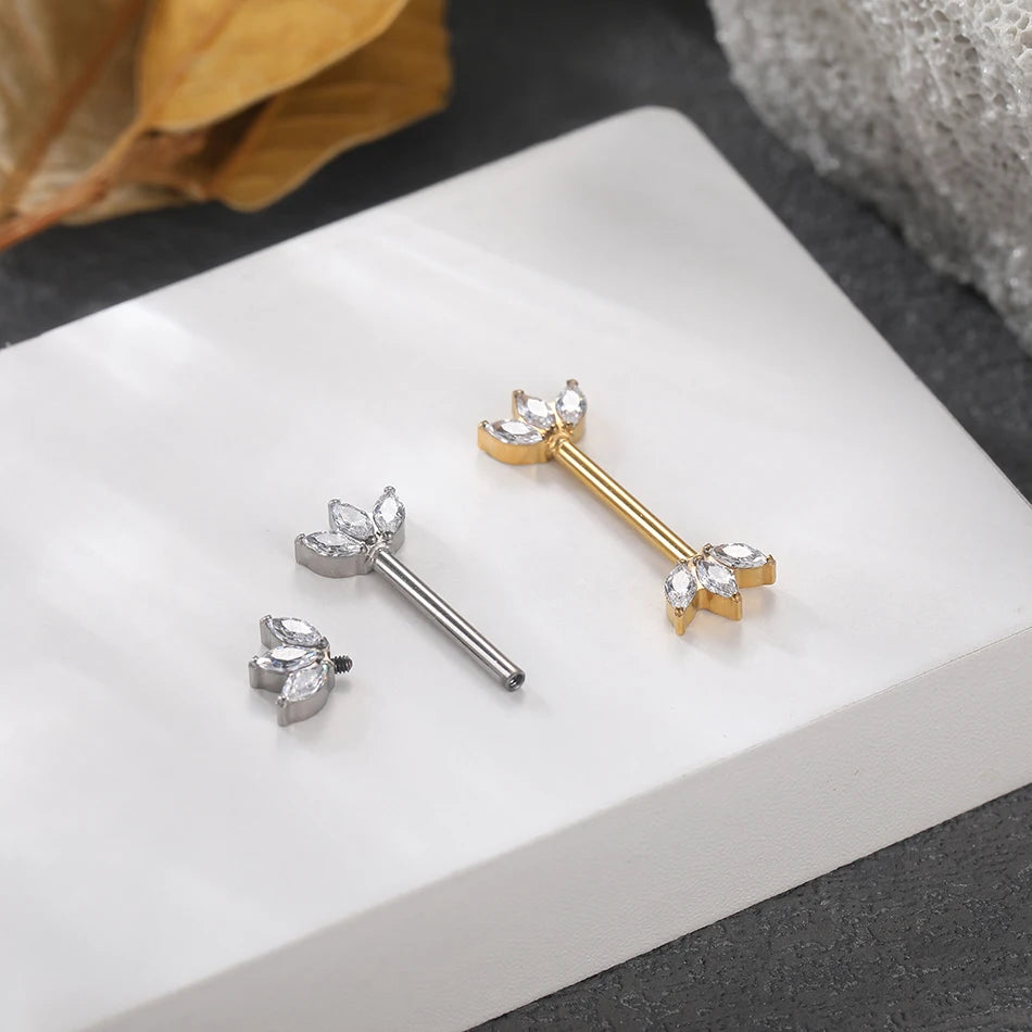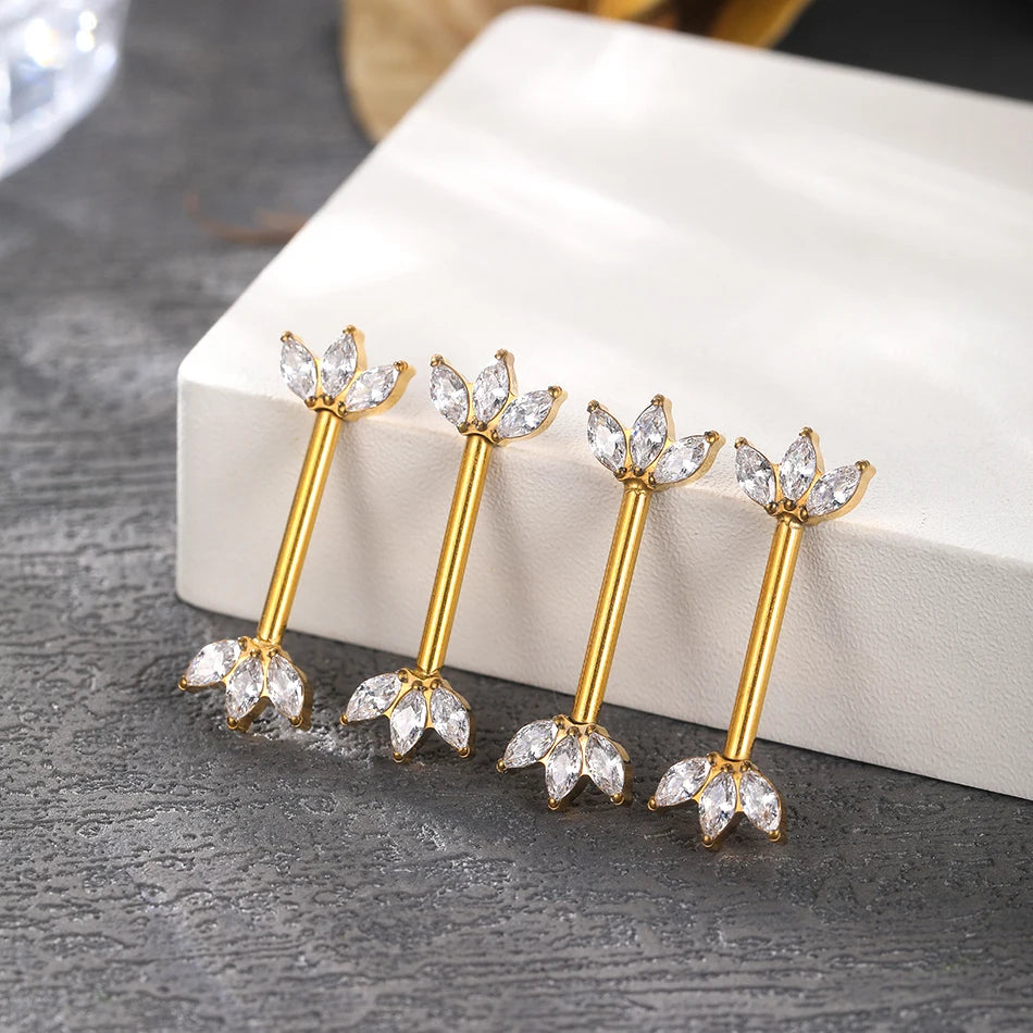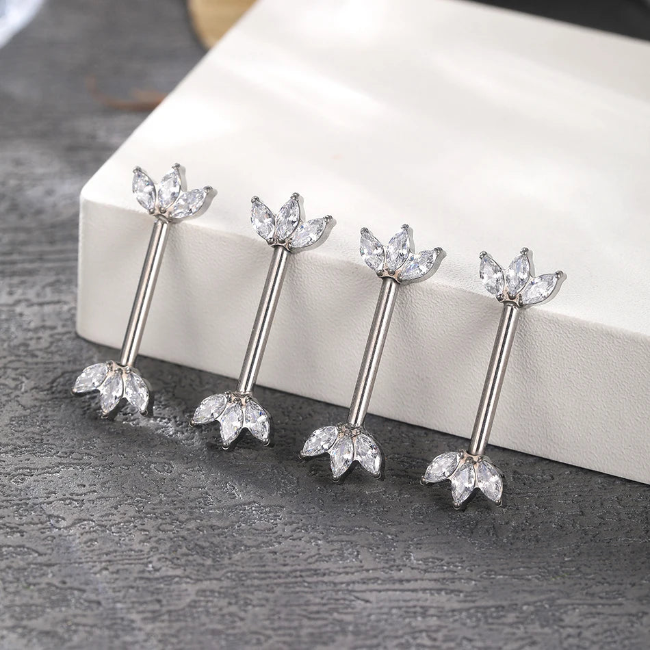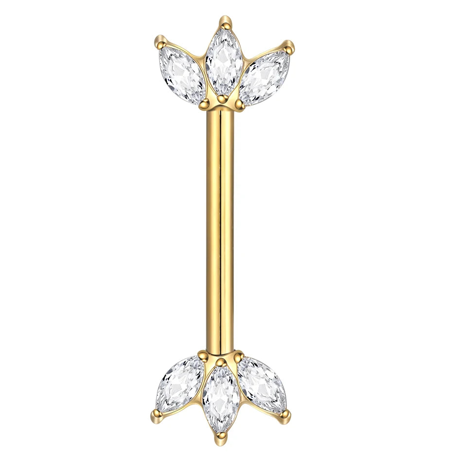 Élevez votre style avec Elysia, une barre de piercing en titane sublimée par des zircons taillés en forme marquise. Confortable, durable et hypoallergénique, elle allie brillance et élégance dans un design épuré.