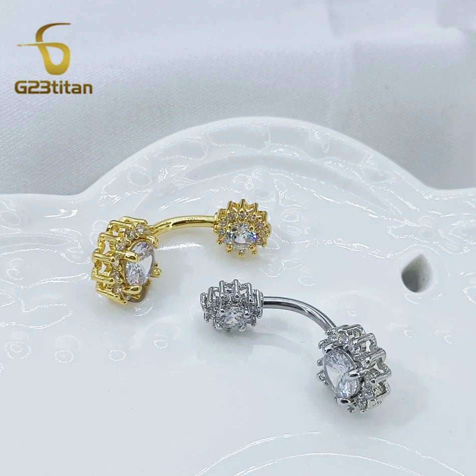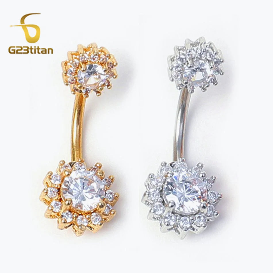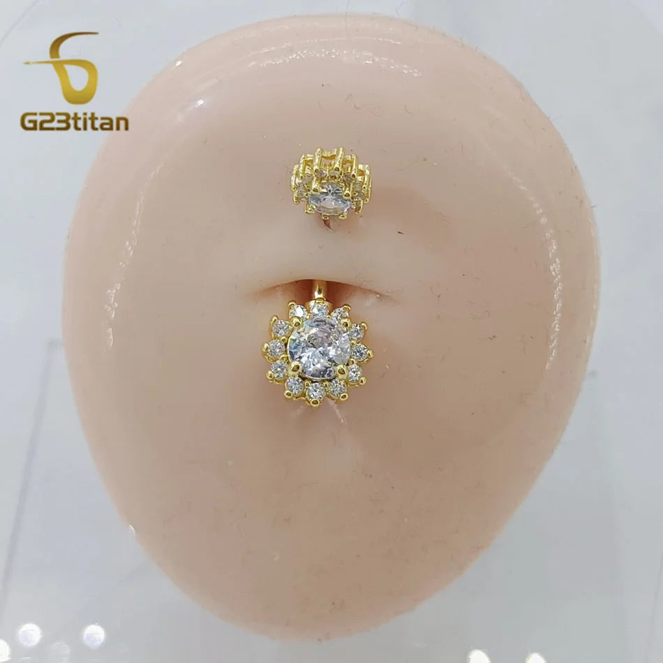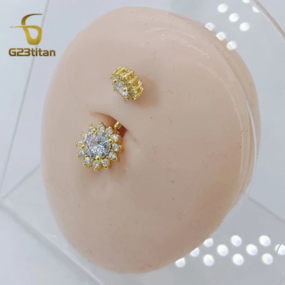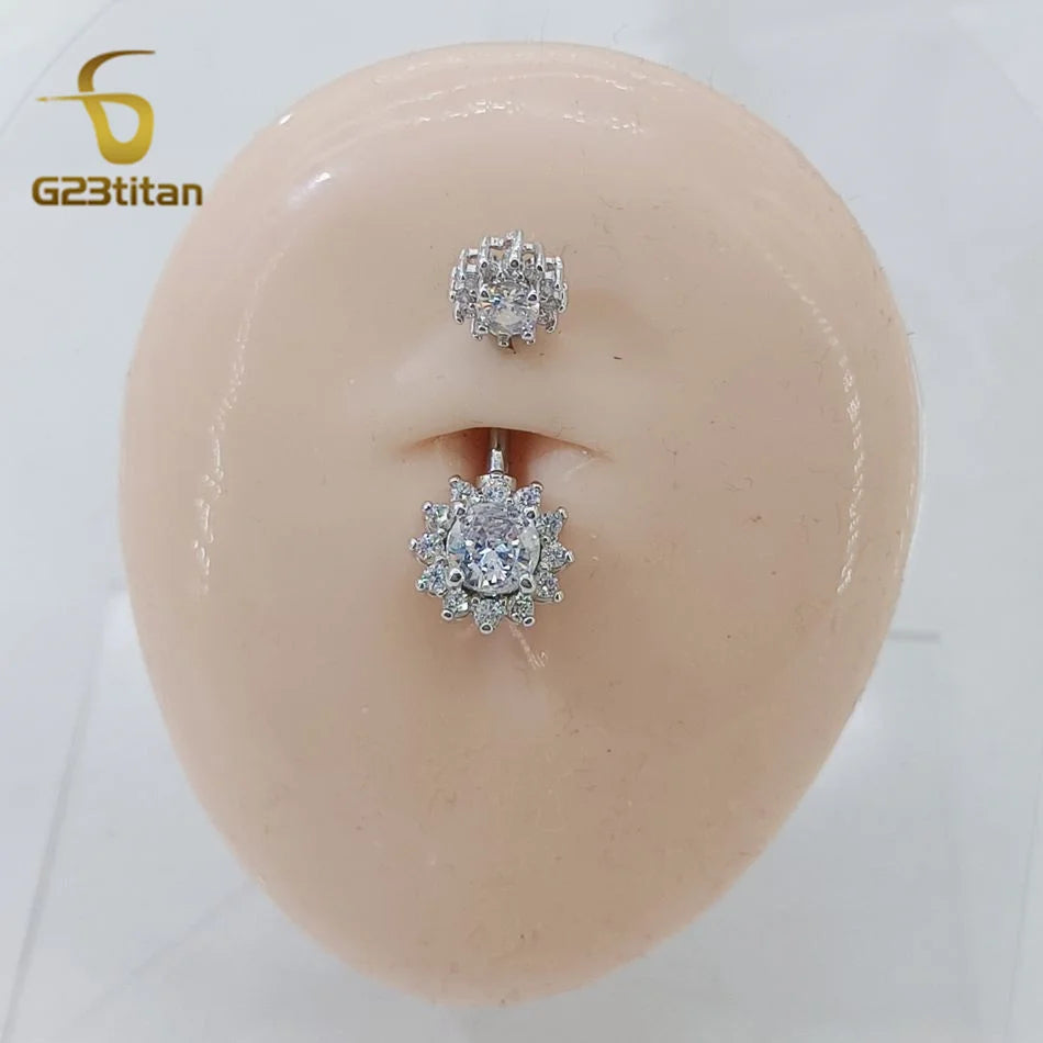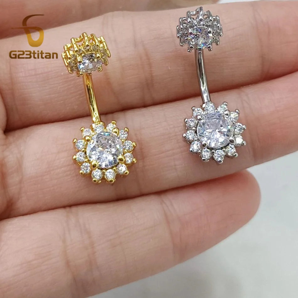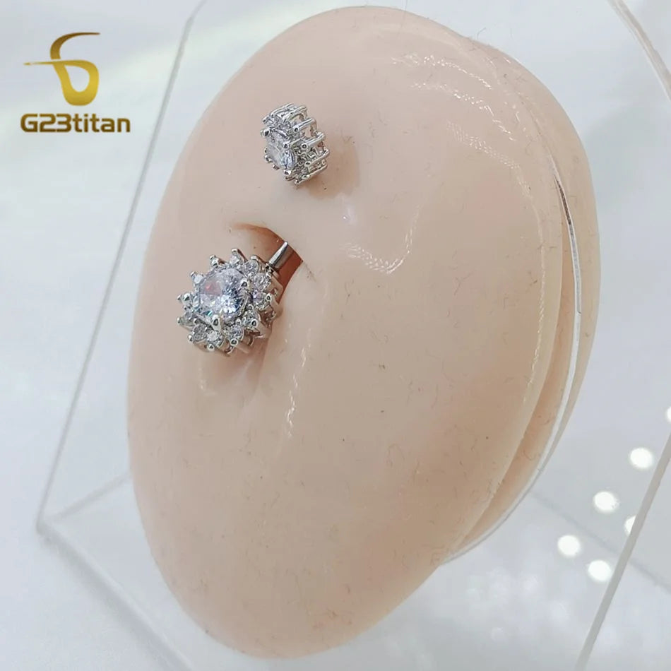 Sublimez votre nombril, un bijou raffiné conçu pour allier éclat et modernité. Cette barre de nombril gauge 14G (1,6 mm) à longueurs 10 mm est pensée pour sublimer votre ombilic grâce à son motif tournesol bicolore, serti de zircons scintillants.