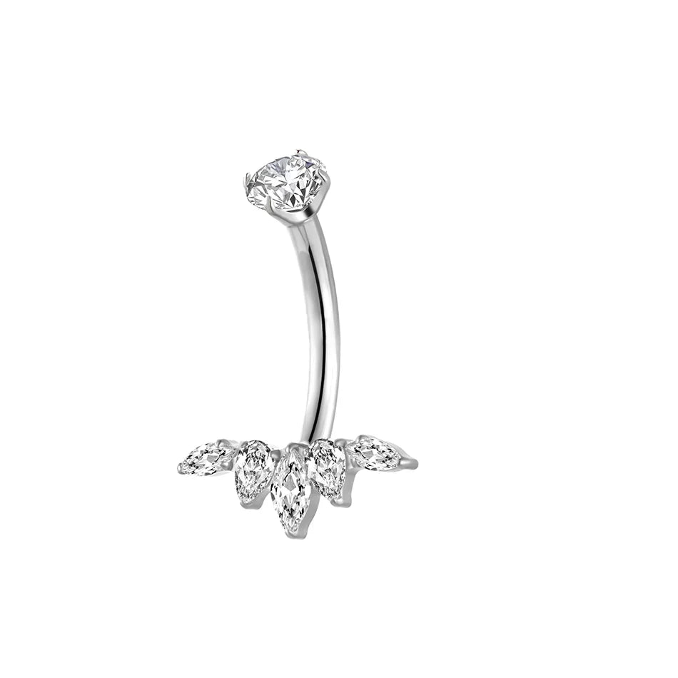 Barre incurvée 14G / 10 mm : Format standard pour un piercing du nombril confortable, bien adapté à la morphologie.