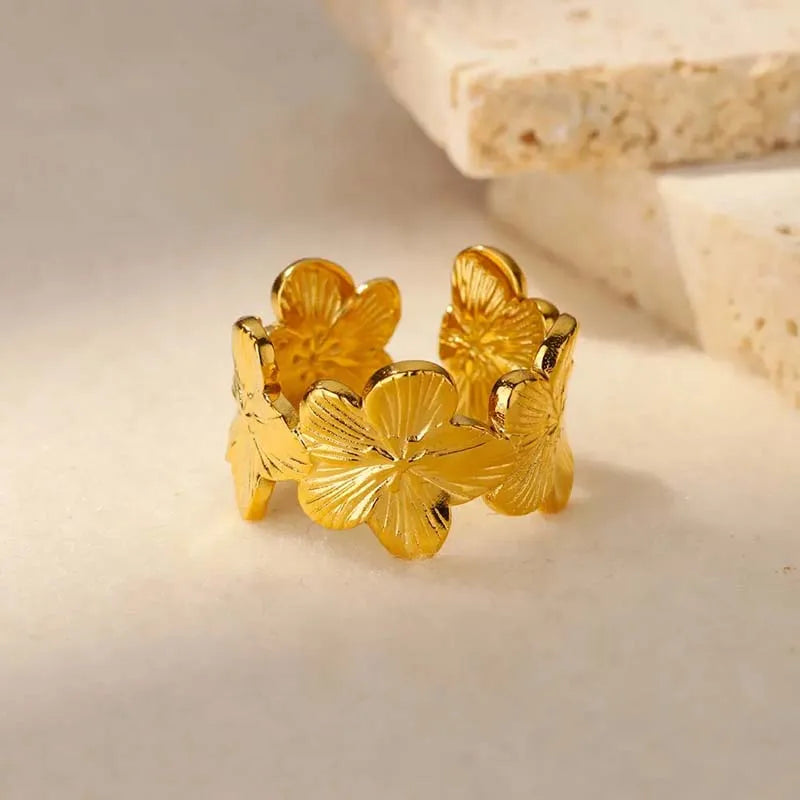 Apportez une touche de sophistication à votre style avec cette bague fleur spectaculaire. Conçue en acier inoxydable de haute qualité, elle est durable, résistante à la corrosion et conserve son éclat au fil du temps. Le plaquage or 18 carats PVD lui offre une finition luxueuse et brillante, idéale pour celles qui aiment le raffinement.
