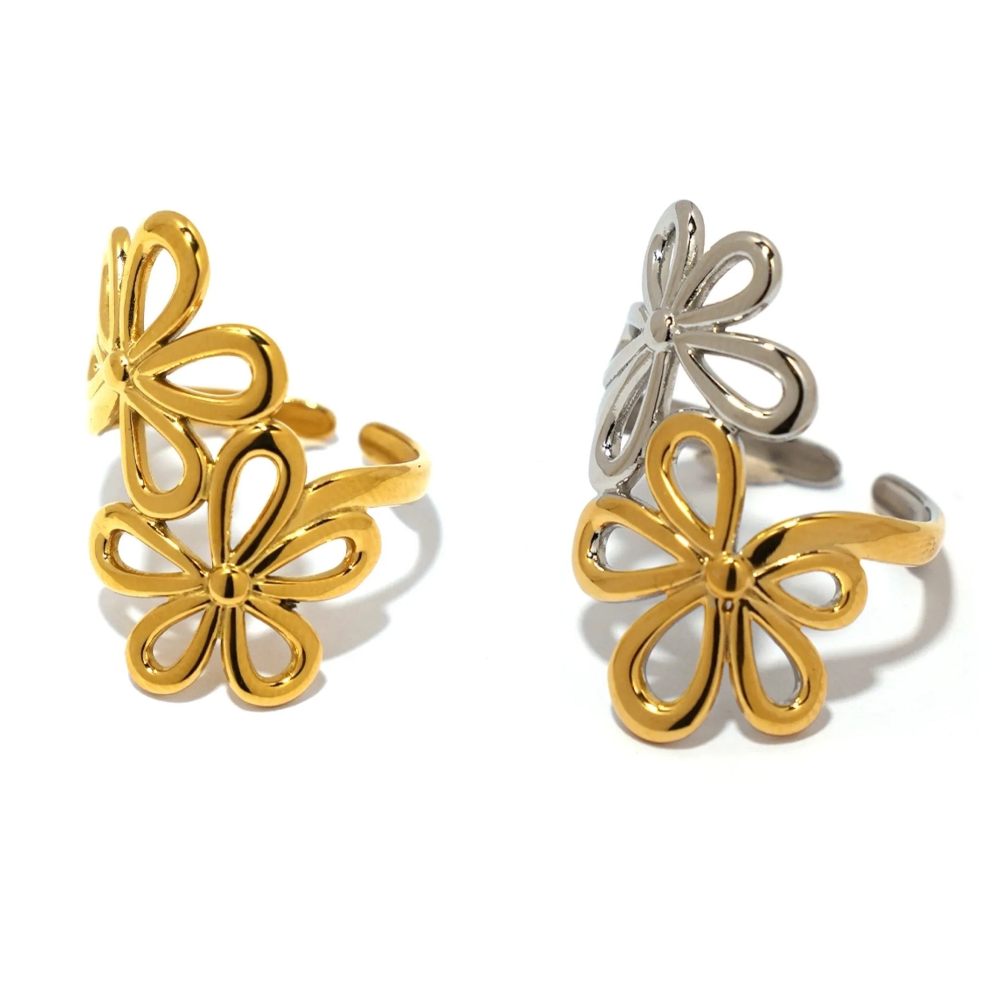 Son design unique combine une fleur irrégulière délicate et une forme géométrique moderne, créant un bijou à la fois tendance et raffiné. La bague est ouverte et réglable, ce qui permet de l’adapter facilement à toutes les tailles de doigt.