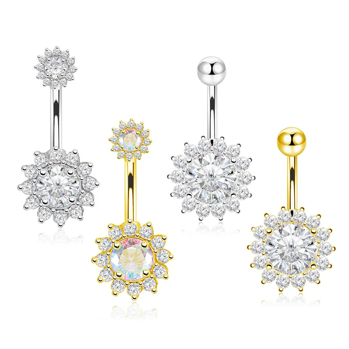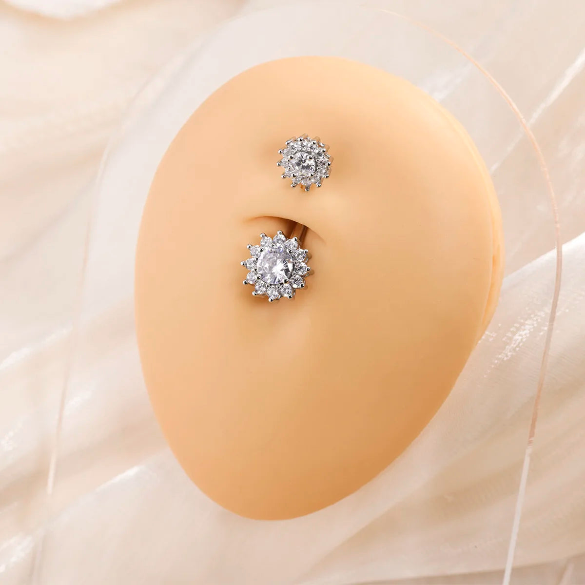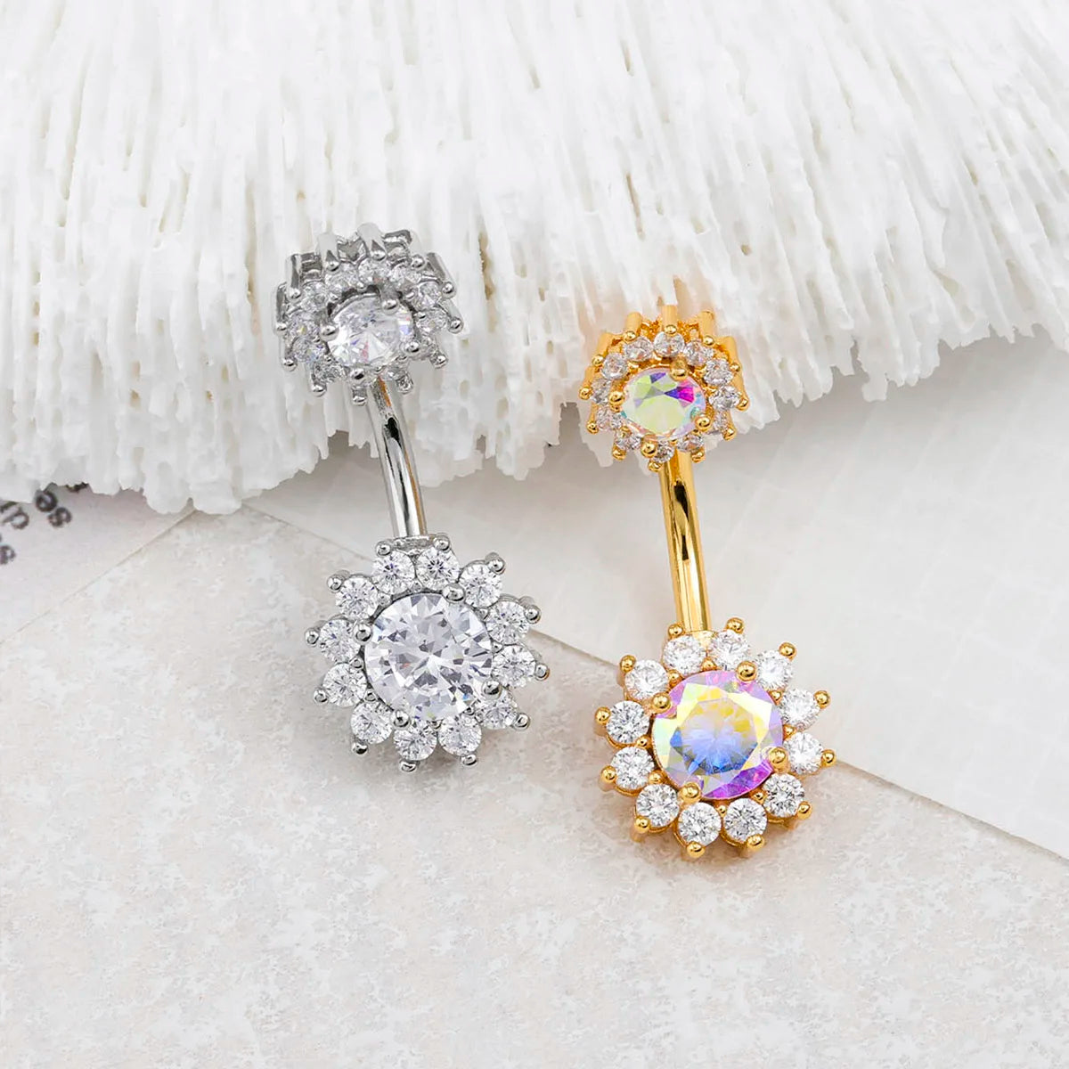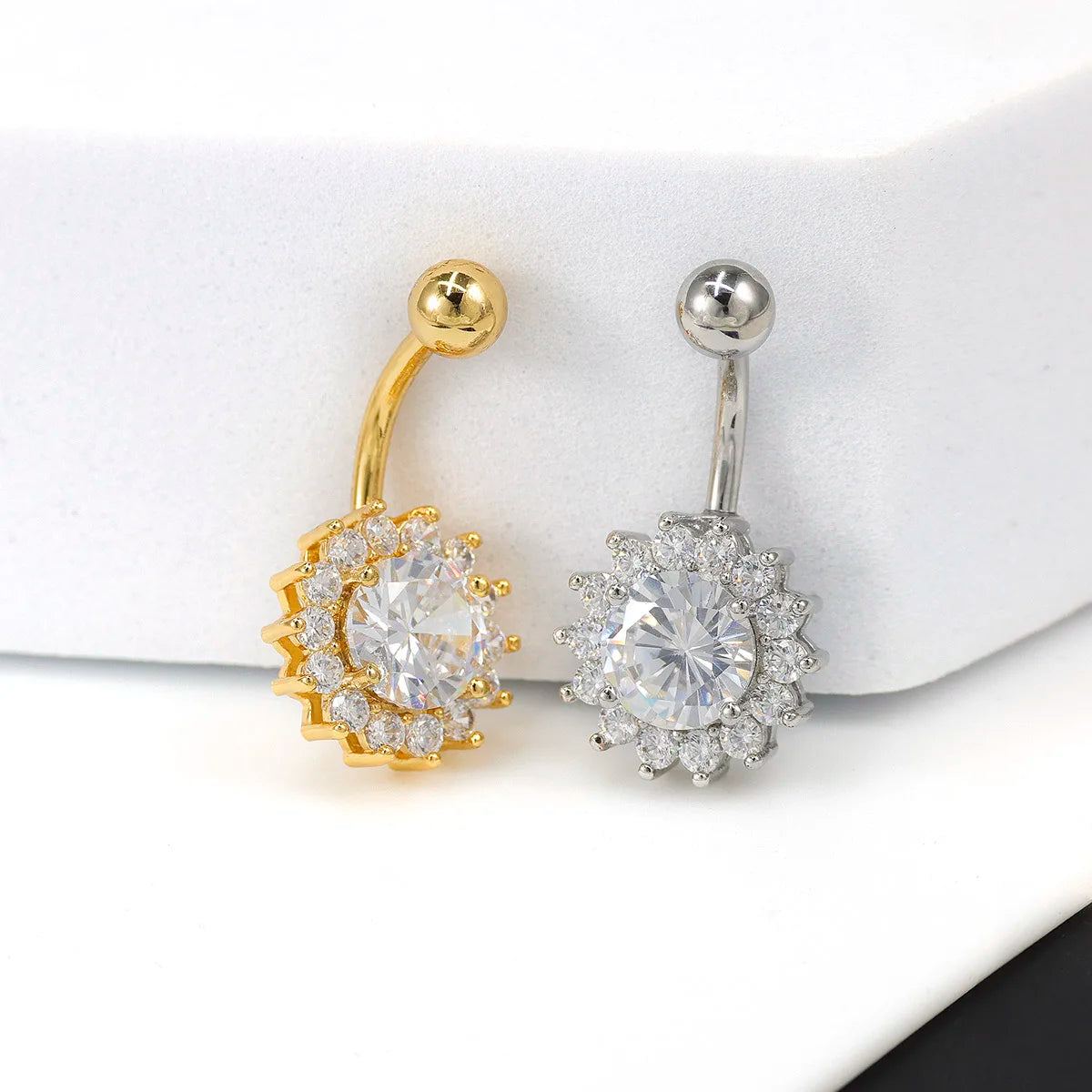 Ajoutez une touche radieuse à votre piercing du nombril, un anneau en titane de qualité médicale décoré d’un motif tournesol scintillant de zircons AB blancs. Conçu pour allier durabilité, confort et éclat, ce bijou sublimera votre décolleté avec élégance.